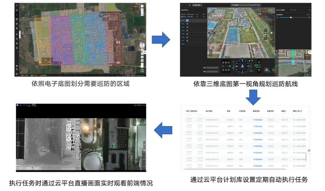 化工产业园 当地消防站所负责的辖区面积较大,除核心化工园区外,还延伸至周边城镇。自成立以来,该站年均出警量超过 600 次,人力紧张和信息化手段的不足给消防日常巡查工作带来新的挑战。为加强辖区内消防安全管理水平,贯彻落实“一短三快”初战机制改革工作,提升消防救援人员快速、安全、高效的灭火救援能力,该消防站引入大疆机场 2,增添空中巡查力量,针对重点区域开展自动化、常态化巡防,及时应对警情。